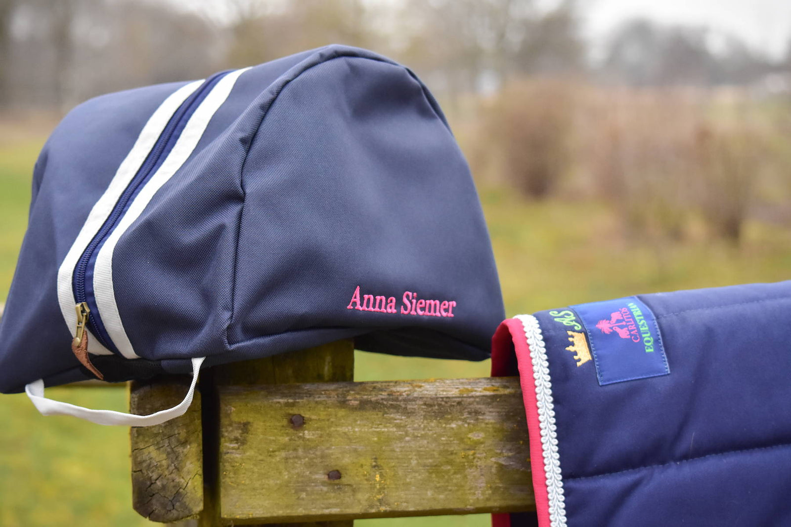 Dzięki uchwytowi do przenoszenia torba na kask jest nie tylko zawsze pod ręką. Można go również doskonale zawiesić w szafce na halsy, na szatni, końcówkach bokserskich itp. Oczywiście nie powinno zabraknąć monogramu! A może haft ujeżdżeniowy , przełajowy czy skokowy - masz więc pewność, że wybierzesz odpowiednią czapkę!