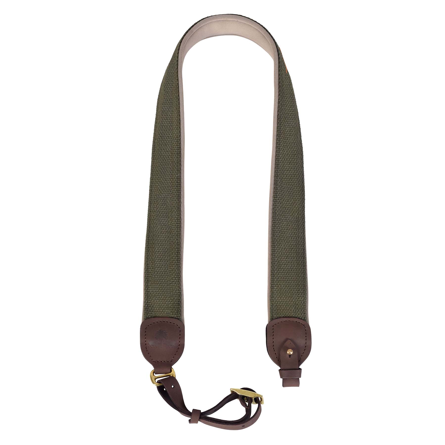 Robuster Gewehrriemen aus Baumwollgurtband in Khaki mit dunkelbraunen Lederdetails. Stufenlos verstellbar und geräuscharm. Optional mit Neopren-Polsterung für zusätzlichen Schulterkomfort.