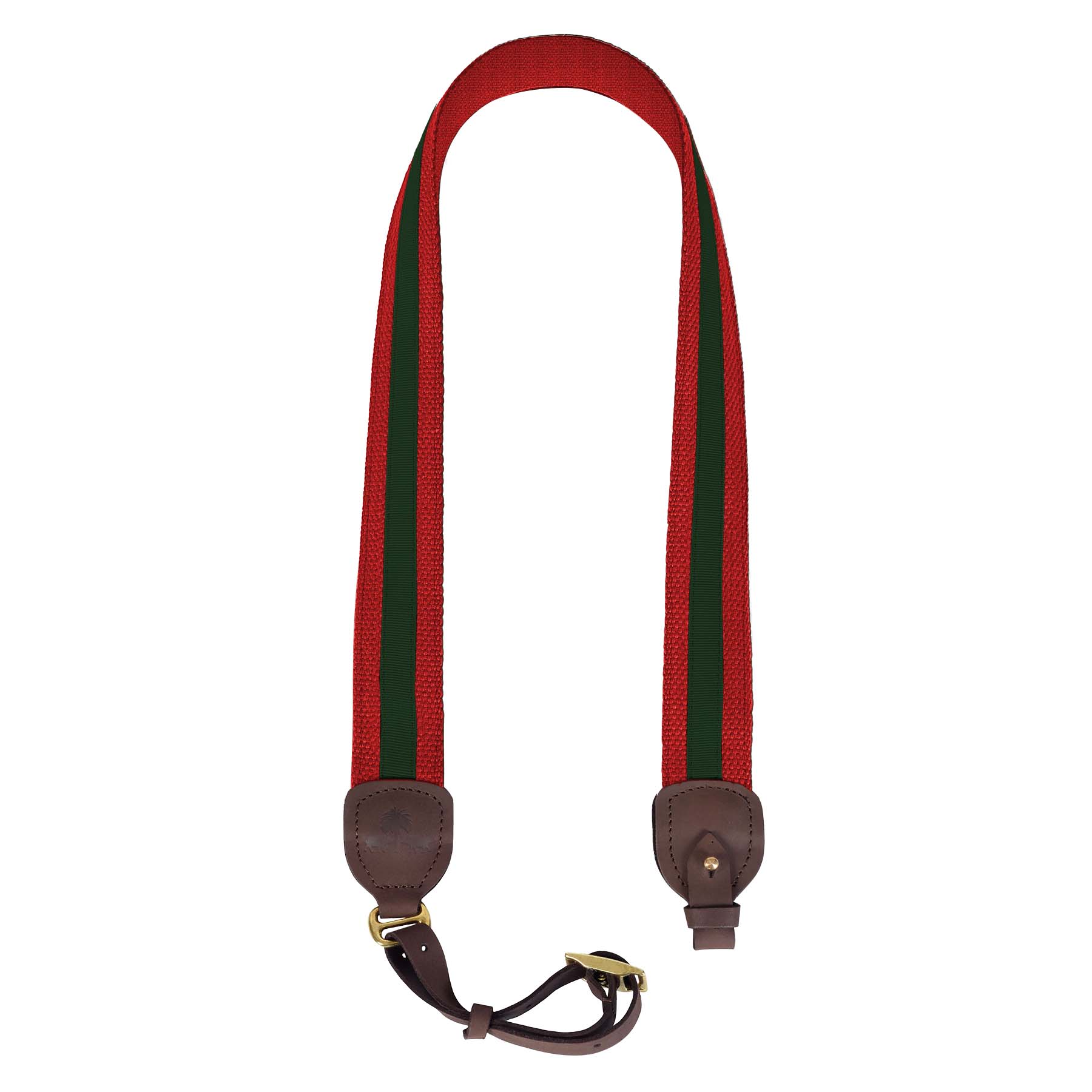 Robuster Gewehrriemen aus Baumwollgurtband in Rot & Dunkelgrün mit dunkelbraunen Lederdetails. Stufenlos verstellbar und geräuscharm. Optional mit Neopren-Polsterung für zusätzlichen Schulterkomfort.