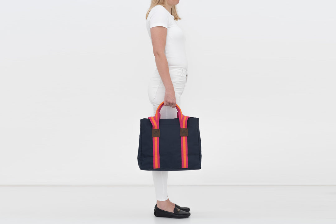Angenehm für den Transport in der Hand: Die kurzen, rundgenähten Henkel.