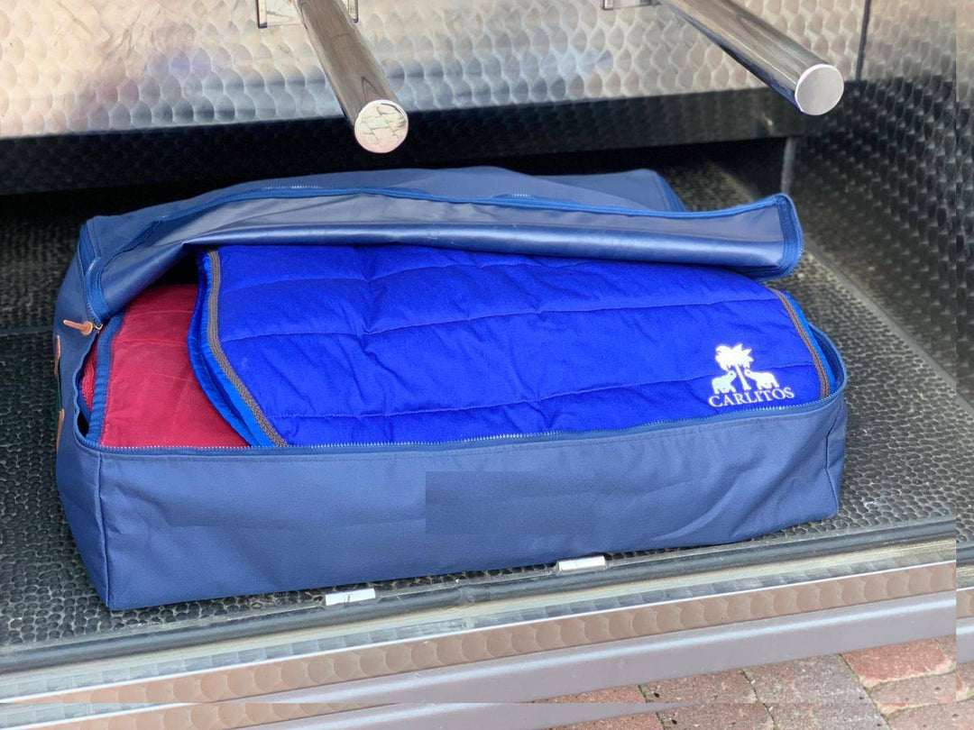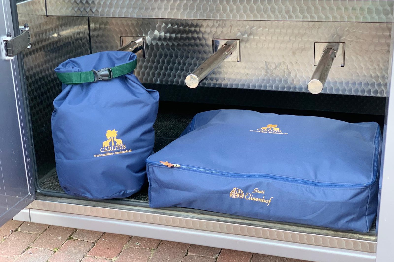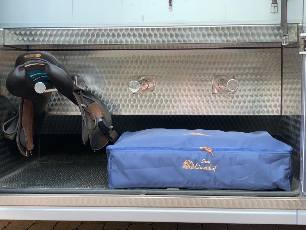 Passt perfekt auf den mobilen Sattelschrank und in den Kofferraum. Auf dem Turnier ist so deutlich mehr Platz im Sattelschrank denn die weißen Schabracken sind staub und dreckgeschützt in der Sattelpadbag verstaut.