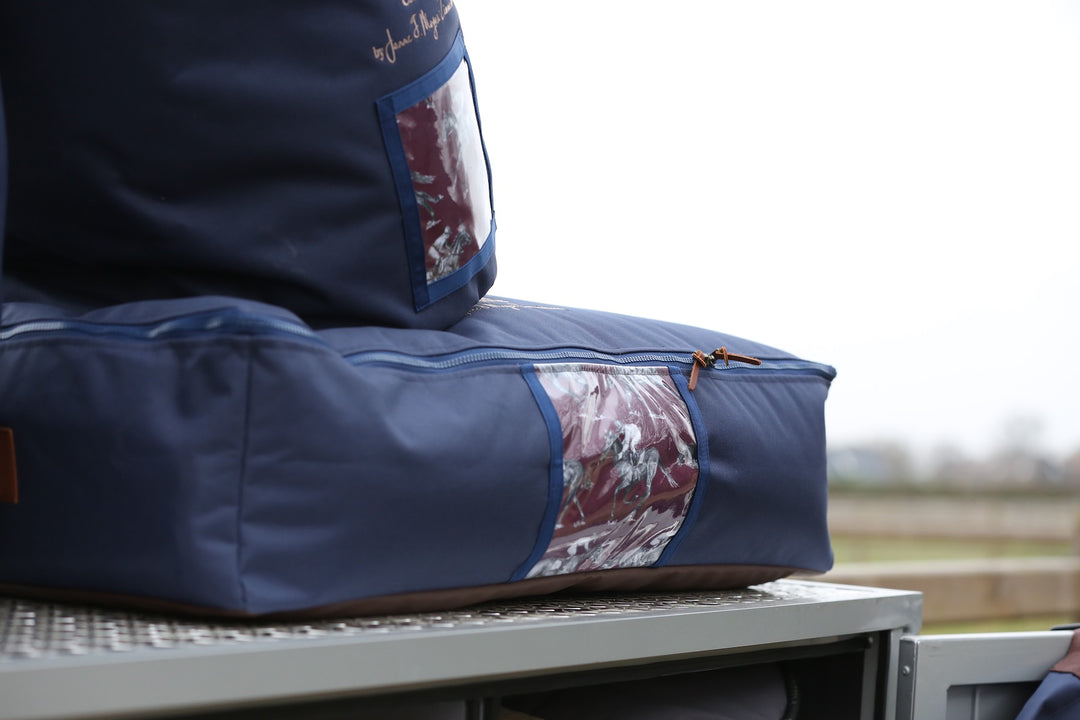 In dieser Tasche lassen sich sauber und ordentlich Sattel- und/oder Pferdedecken sowie weiteres Zubehör aufbewahren. Sie schützt den wertvollen Inhalt vor Staub und Feuchtigkeit- auch weiße Turnierschabracken bleiben ohne Verschmutzung bis zum Gebrauch.