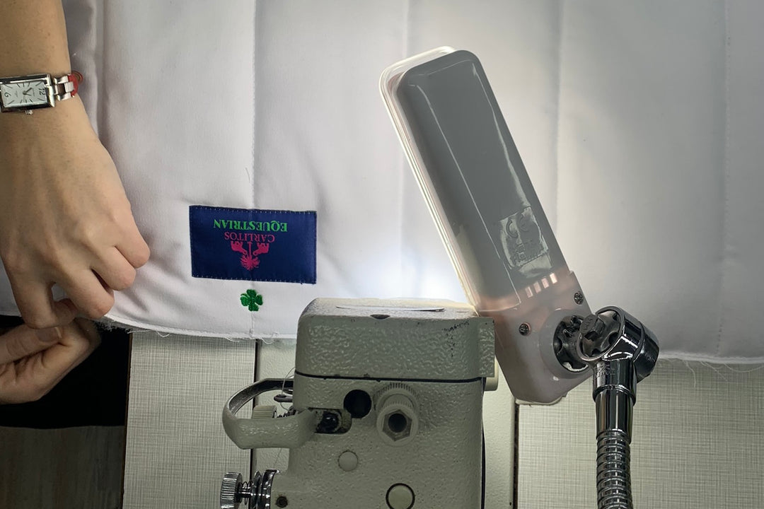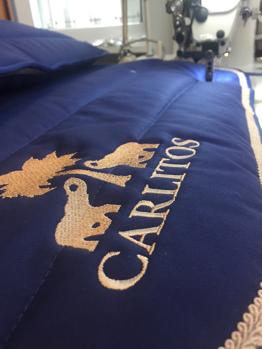 Bei uns in der Manufaktur wird per Hand zugeschnitten, gesteppt und genäht. Bestickungen erfolgen stets vor dem Zusammennähen der Satteldecke so dass keine unsaubere Rückseite entsteht.