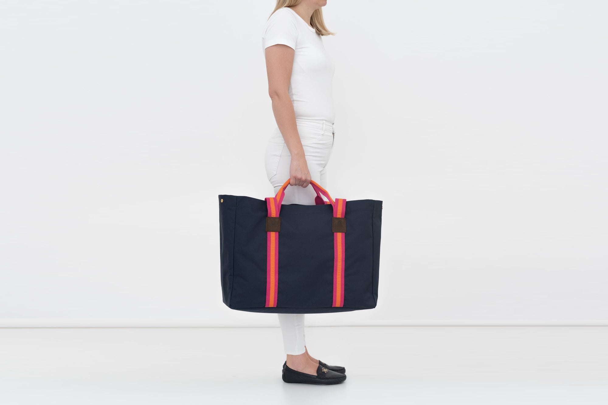 Durch die seitlichen Druckknöpfe lässt sich der Shopper in der Größe anpassen.